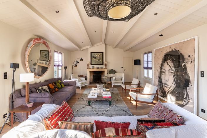 À quelques minutes du village des Portes en Ré, à 10 minutes à pied du marché, cette maison de 260 m2, à l’architecture rétaise, dispose de sept chambres : deux isolées dans l’annexe, cinq réunies dans la partie nuit, dont trois sont installées au rez-de-chaussée. Outre l’extérieur complètement réaménagé avec deux terrasses – dont une abritée du vent pour les parties de ping-pong – c’est un bel espace de vie qui s’articule entre une immense cuisine « à vivre » et un salon à l’esprit bohème, équipé d’une immense cheminée. Le petit plus ? Un salon « télé » pour ne pas casser l’ambiance. La maison de vacances idéale.