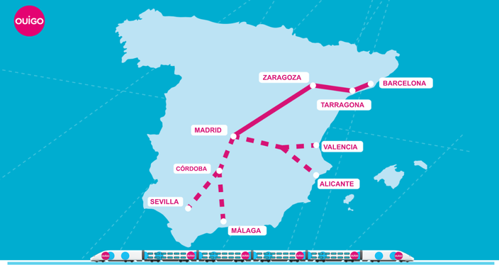 La SNCF va assurer cinq allers-retours quotidiens à grande vitesse entre Barcelone et Madrid sous sa marque Ouigo. À l’occasion de ce lancement, les billets sont commercialisés à partir de 9 €.