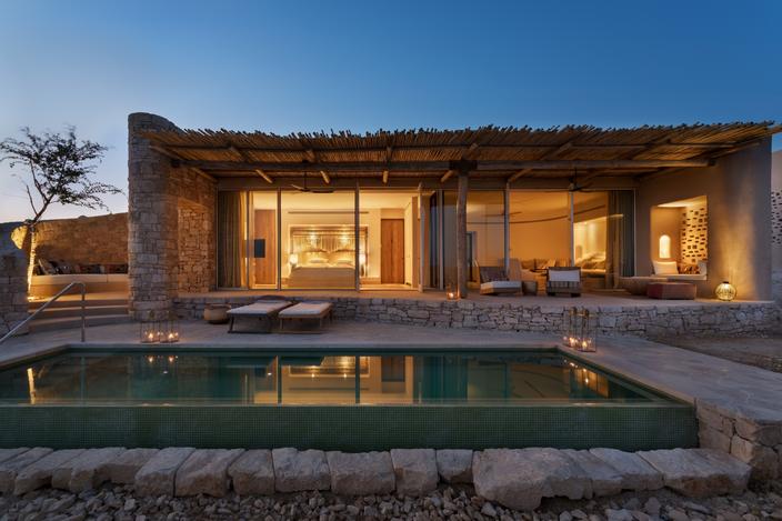 Début avril, les premiers hôtes poseront enfin leurs valises dans les sables du désert du Négev à la hauteur de la vallée de l’Arava. C’est ici que, perchées sur une falaise, les 58 suites et villas du Six Senses, inspirées des habitations de la communauté nabatéenne qui occupait la région il y a plus de 2000 ans, englobent un paysage biblique. Shaharut, qui signifie «le moment juste avant l’aube», traduit bien l’ambiance du lieu mentionné sous le nom de Midian dans la Bible et le Coran. Pour se fondre dans cet environnement grandiose et réduire l’impact écologique, le Six Senses est construit à partir de roches locales enduites de pigments naturels. Sa décoration intérieure évoque la Route de l’encens, qui des ports méditerranéens à l’Inde traversait le désert. Les portes intérieures ont été taillées dans du teck récupéré sur des bateaux, des maisons et des passerelles désaffectés tandis qu’une flore indigène égaiera ses jardins. Le restaurant conviera à vivre sous une tente une expérience gastronomique bédouine. Spa, piscines intérieure et extérieure, cours de yoga, cinéma en plein air, kids club et safaris à chameau agrémenteront le séjour.