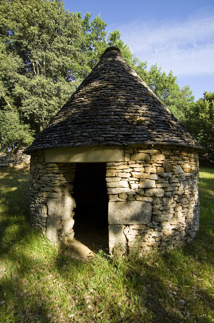Au-dessus de Tournepique, le sentier s’immerge dans une vague de charmes et de noisetiers, à laquelle succède la longue houle des chênes verts, ceux-là même dont les feuillages sombres et persistants ont donné sa «couleur noire» à cette partie du Périgord. Ce Périgord Noir, décidément béni des dieux, recèle à l’orée de ses obscures forêts un patrimoine bâti exceptionnel. Comme cette borie que les paysans du coin préfèrent nommer sans façon cabane ou cazelle, un abri tout rond construit avec les pierres sèches extirpées de terre par le soc de la charrue. Leurs lourdes toitures de lauzes forment une voûte parfaite, parfois suffisamment vaste pour y loger une paire de bœufs. Voilà bien 20 ans que le vent de la restauration architecturale souffle sur le pays, redressant les murs, renforçant les pignons, ajourant les façades aveugles de larges baies vitrées. Des petits chantiers fleurissent un peu partout dans la campagne, comme ici à Générille, où un artisan redonne vie à une maison effondrée à l’aide de ces petites pierres calcaires d’une pâleur un peu roussie, qui donnent tout son caractère au bâti de la région. L’itinéraire conduit en direction du Sud par une petite route peu fréquentée jusqu’à proximité du Château de Lacoste, perché depuis le XVIIe siècle au-dessus du Céou. Son parc renommé est aujourd’hui le cadre de mariages fastueux.